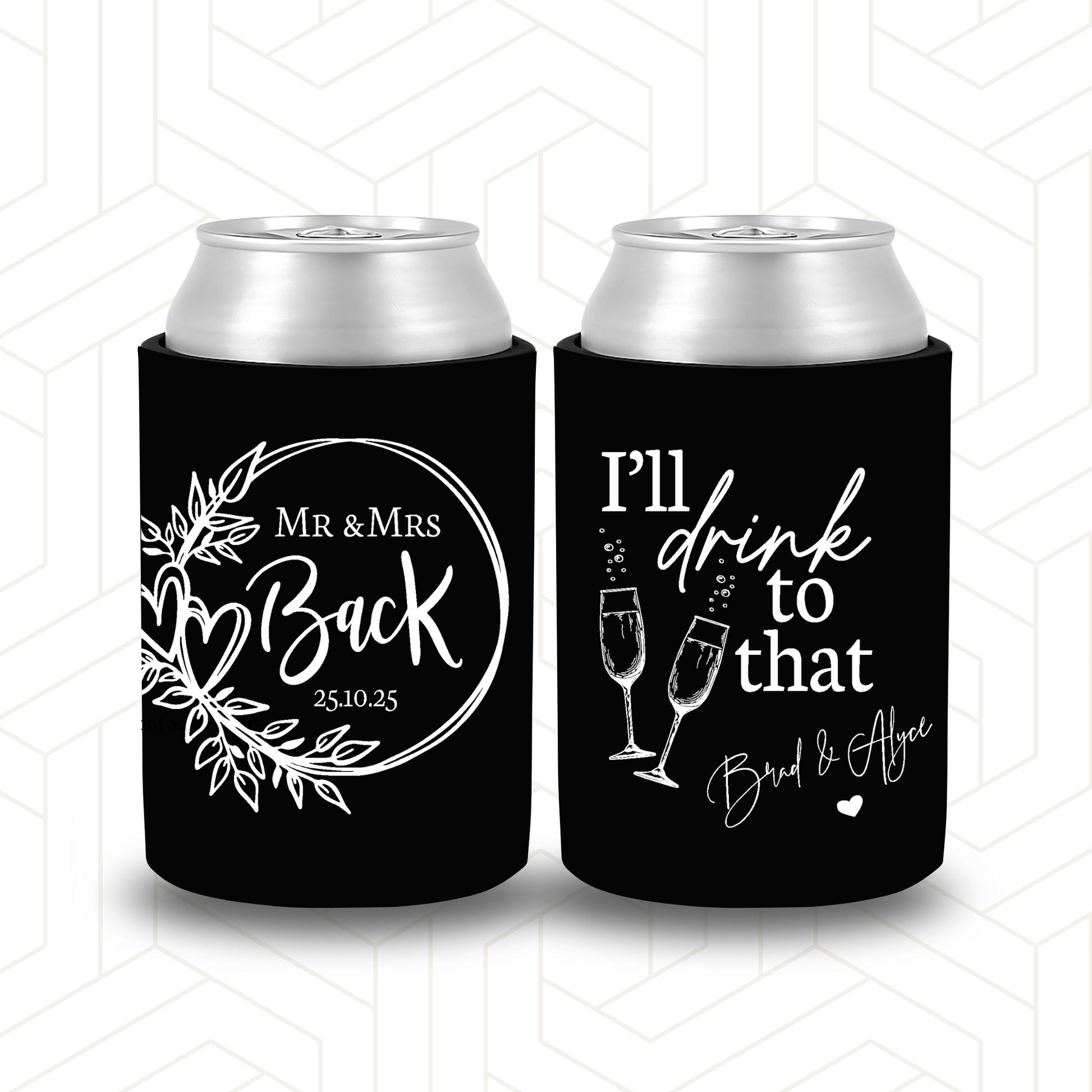 WS019 | Wedding Stubby Holder - Love Heart Wreath with Surname | I’ll Drink to That with Champagne Glasses