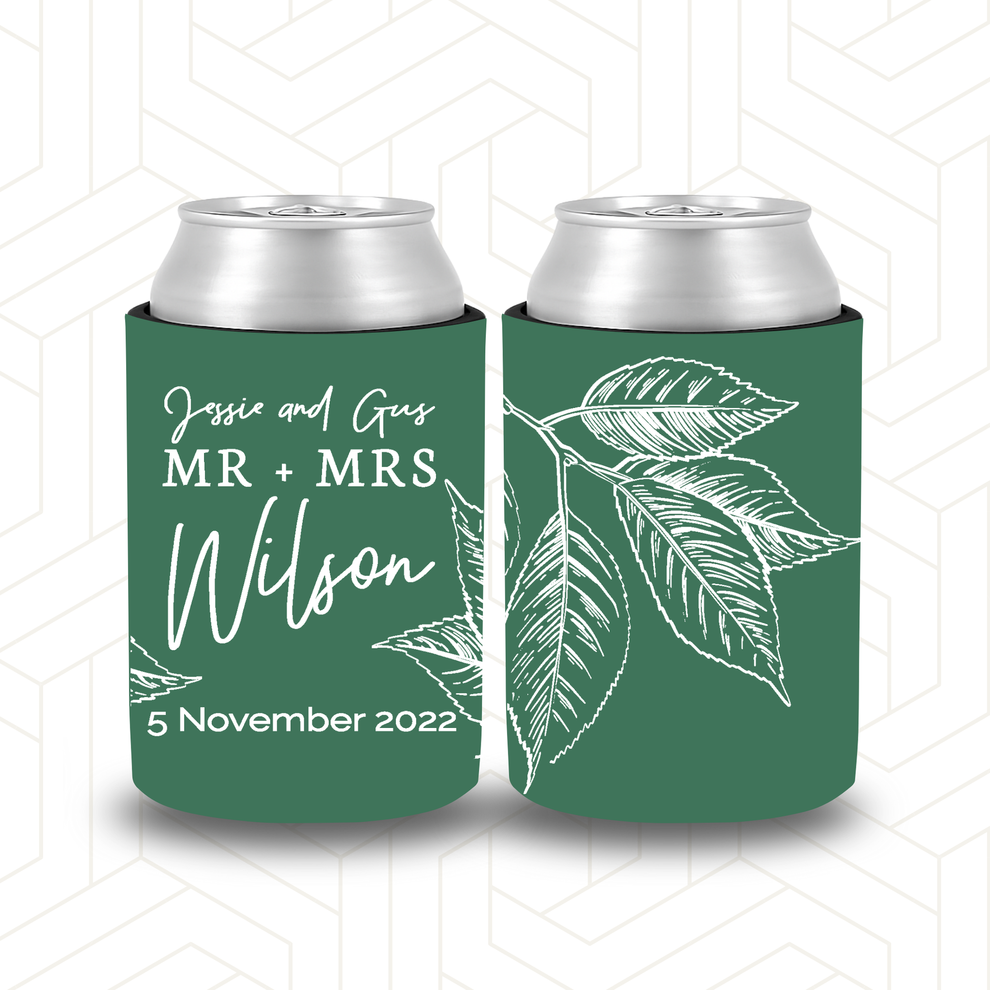 WS001 | Wedding Stubby Holders - Mr & Mrs - with Leaves - Thank you for celebrating with us